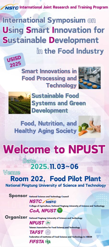 Using Smart Innovations for Sustainable Development in the Food Industry (USISD 2025) You Might Also Like 恭喜本系謝寶全教師榮獲本校110年度傑出貢獻特聘教授 2021 年 9 月 9 日 2022 IUFoST World Food Congress~歡迎報名參加 2022 年 4 月 6 日